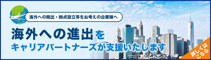 キャリアパートナーズの「海外進出支援室」は、海外経験のある企業OB(業界、業種を問わない)が、輸出或いは拠点設立等をお考えの企業/団体様を支援いたします。どうぞお気軽にご相談ください。